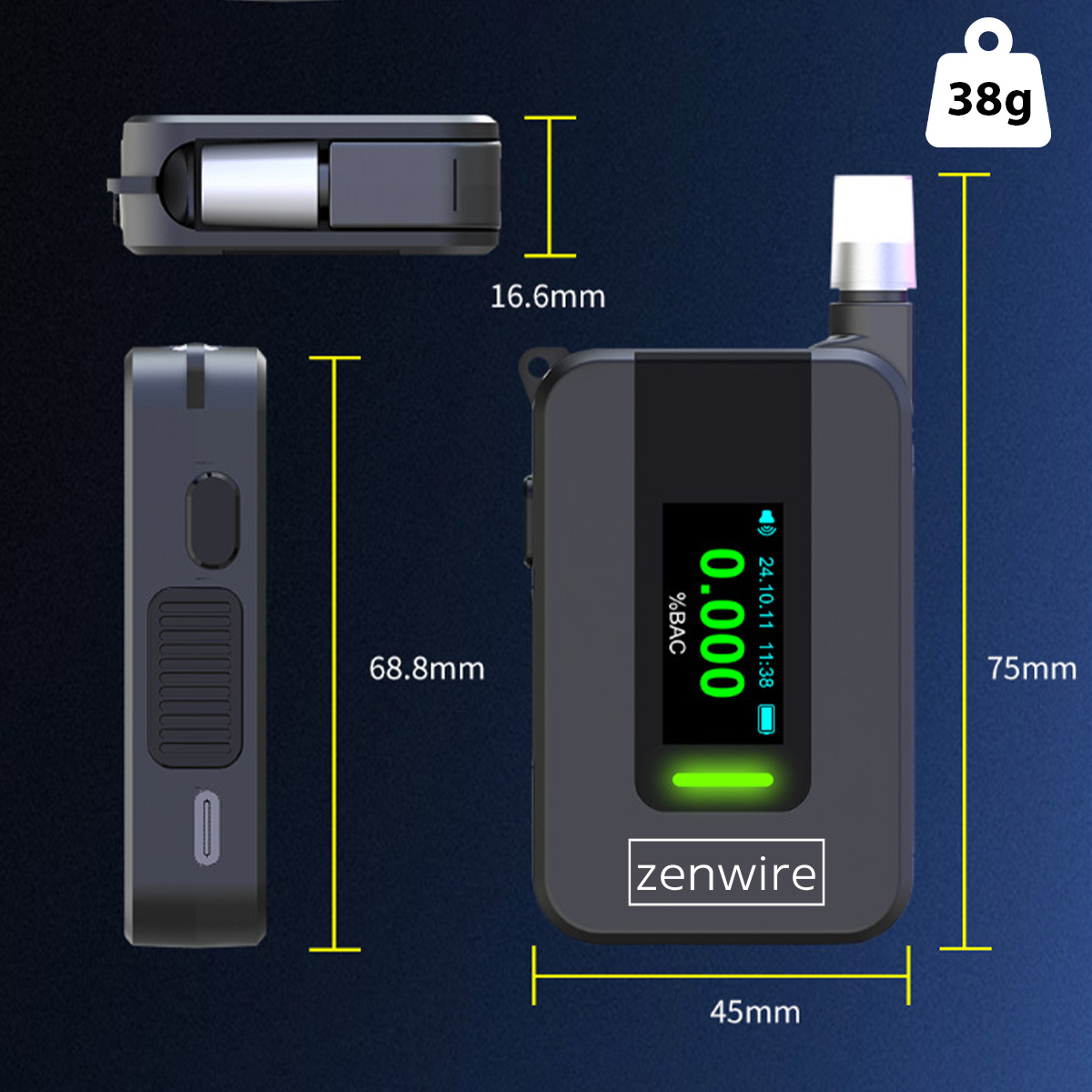 - Skalibrowany i gotowy do użycia alkomat elektrochemiczny Zenwire D1000,