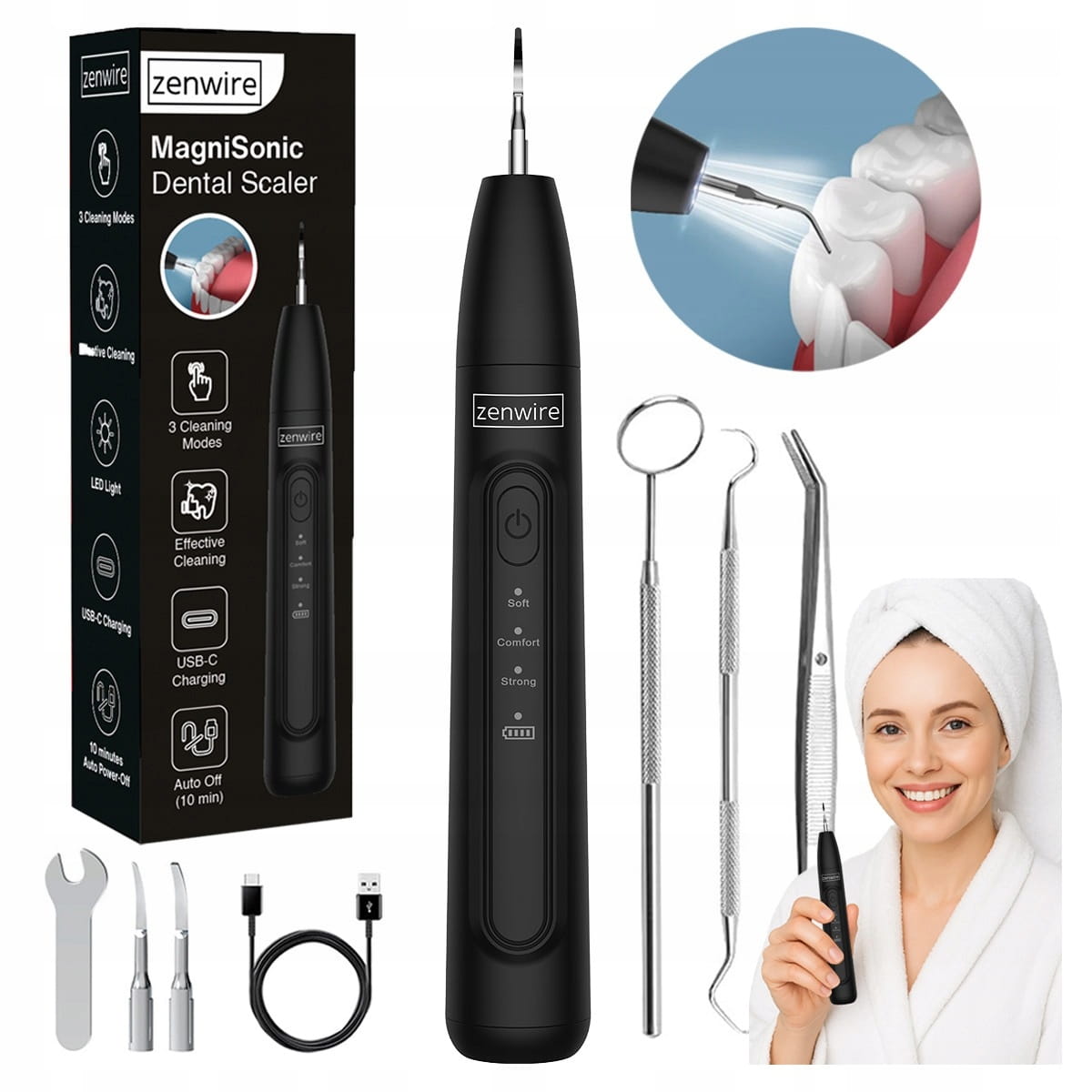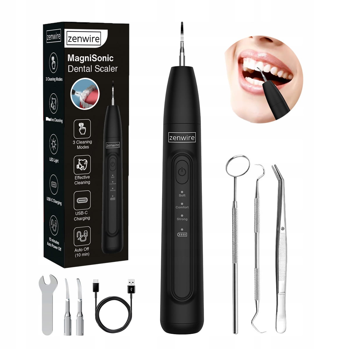 - W zestawie: Skaler MagniSonic Zenwire J09, 2 wymienne głowice czyszczące, klucz montażowy, narzędzia dentystyczne, kabel USB do ładowania,